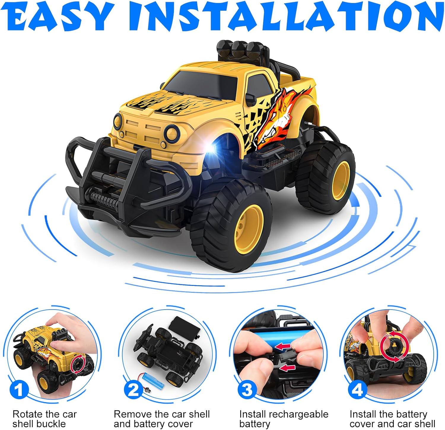 - Full Functioning & Batteries Included: Our 4 channel drive remote control car can go forward, backward, turn left, turn right, front wheel unit guarantees accurate route direction. The rc car comes fully equipped with 1 high-capacity rechargeable battery and 2 AA batteries, providing robust and stable power to conquer any terrain effortlessly. No need to worry about purchasing batteries separately – just unbox the fun and enjoy the thrilling driving experience right away!