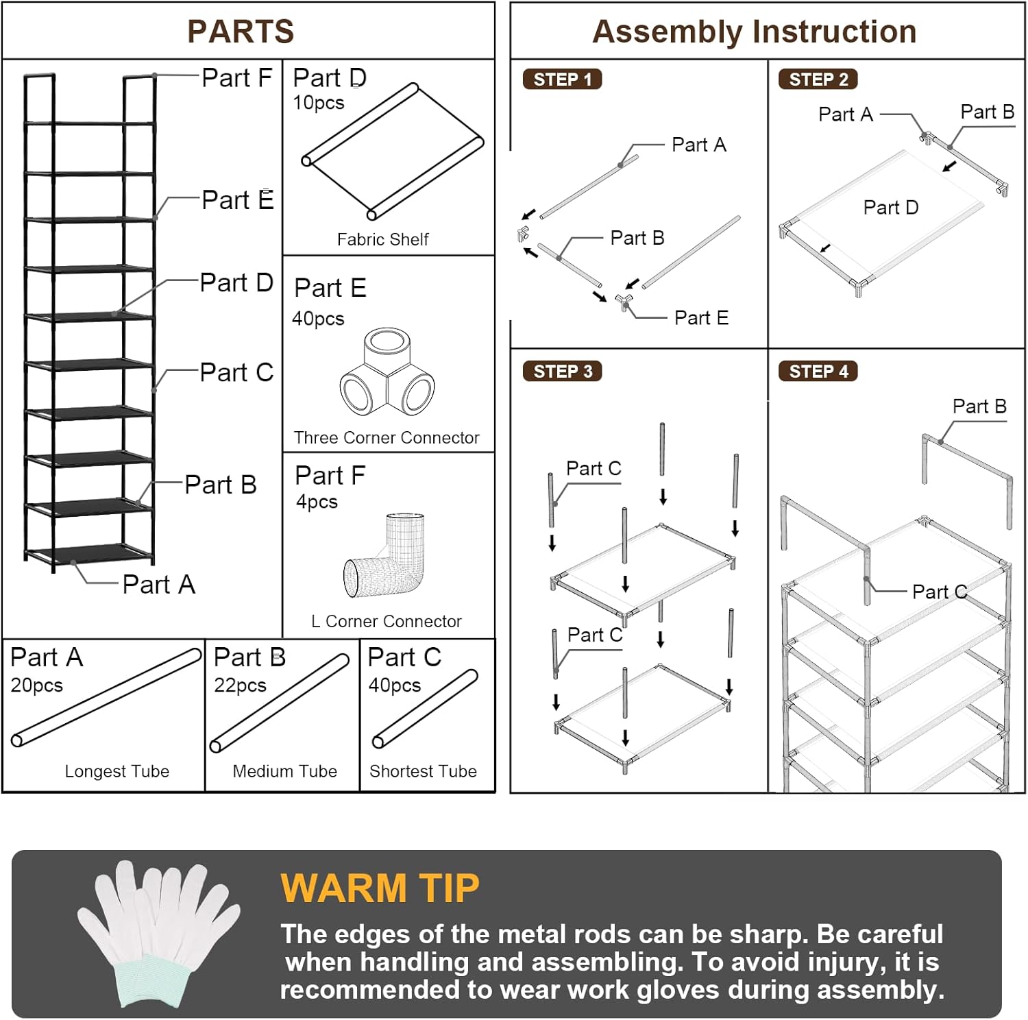 - Easy to Assemble: The shoe shelf is simple in construction and comes with installation instructions to help you assemble and disassemble it quickly. It also comes with gloves and a small hammer to make you spend less time on assembling the shoes rack