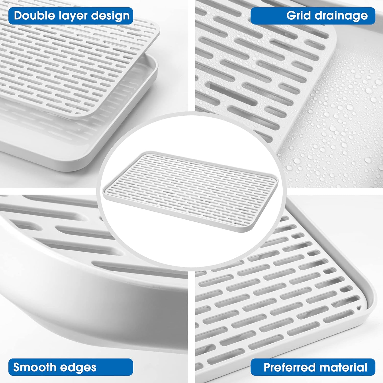 - 【Well-designed Tray】Simple but beautiful, practical and convenient. The higher edge design to prevent water from overflowing and its smooth and round corners giving comfortable touching. Just take out the upper drain board and wipe boarder and tray gently with a cloth to clean it easily