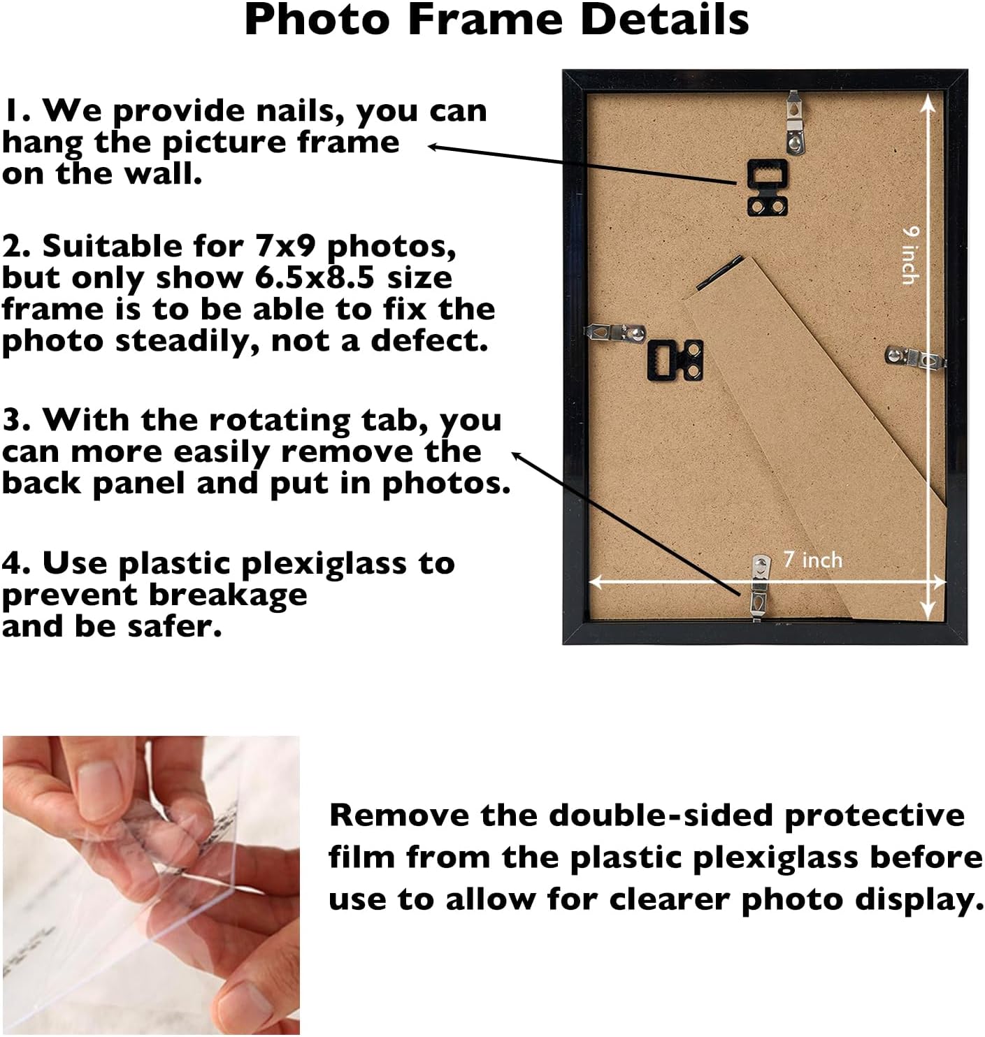 - FRAME SIZE: The black picture frame fits 7x9 photos, simple and stylish, the frame opening display will be 0.5 inches smaller than the photo to better hold the photo instead of a defect.