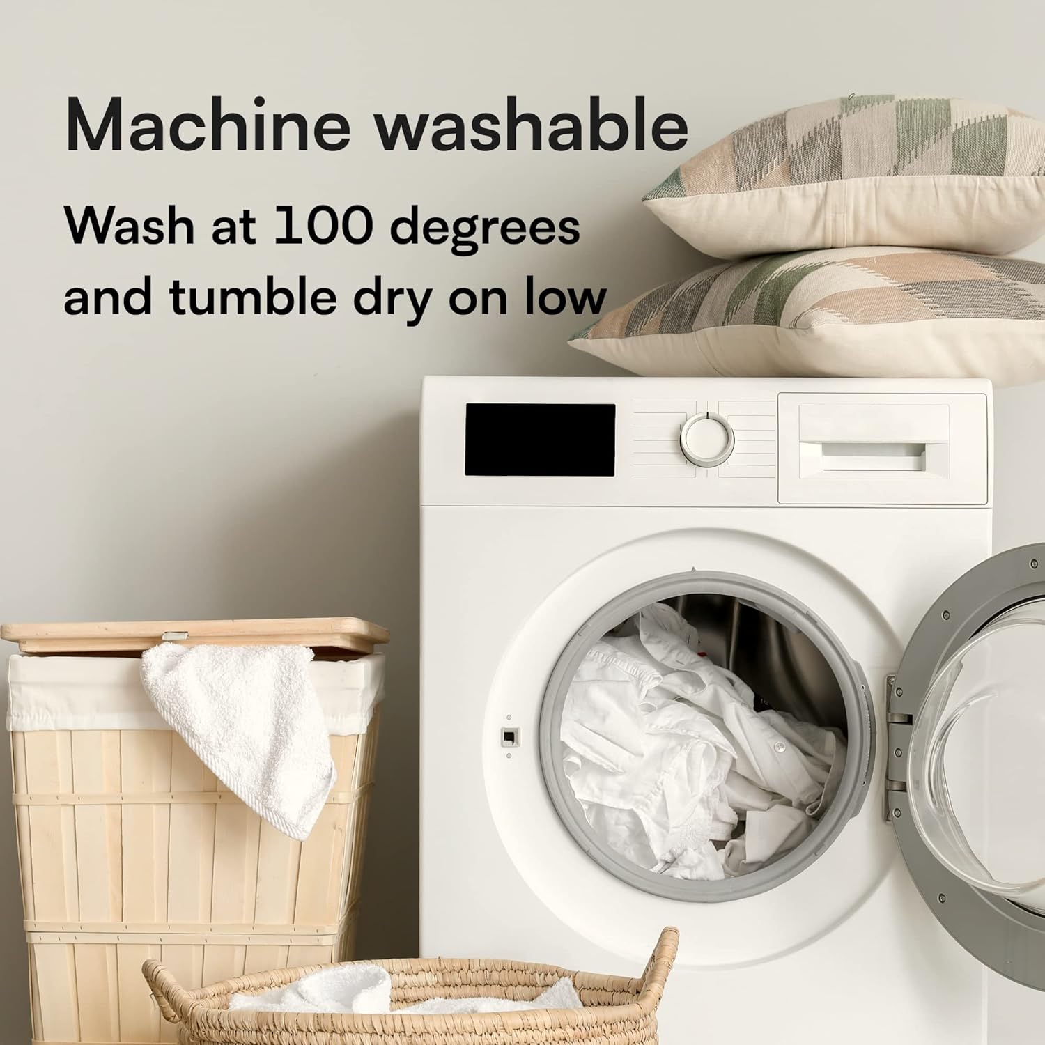 To wash your mattress protector, simply pop it in the washing machine at 100 degrees Fahrenheit. Don’t iron or bleach it, just lay it out to dry or tumble dry on low.
